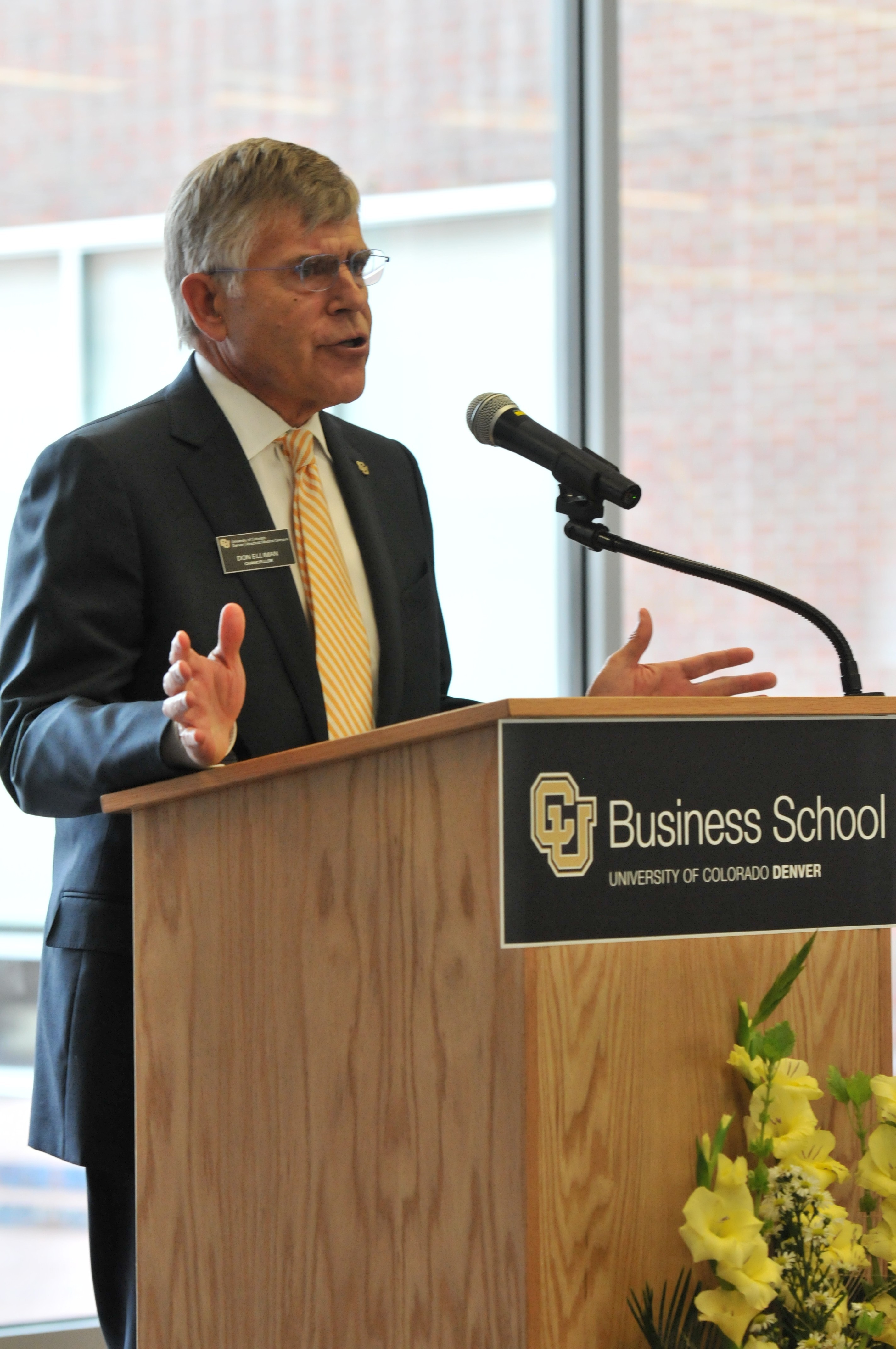 Other speakers at the “We Are Open for Business” celebration included Gov. John Hickenlooper, Chancellor Don Elliman, University of Colorado President Bruce Benson and Michael Carrigan, chairman of the CU Board of Regents.