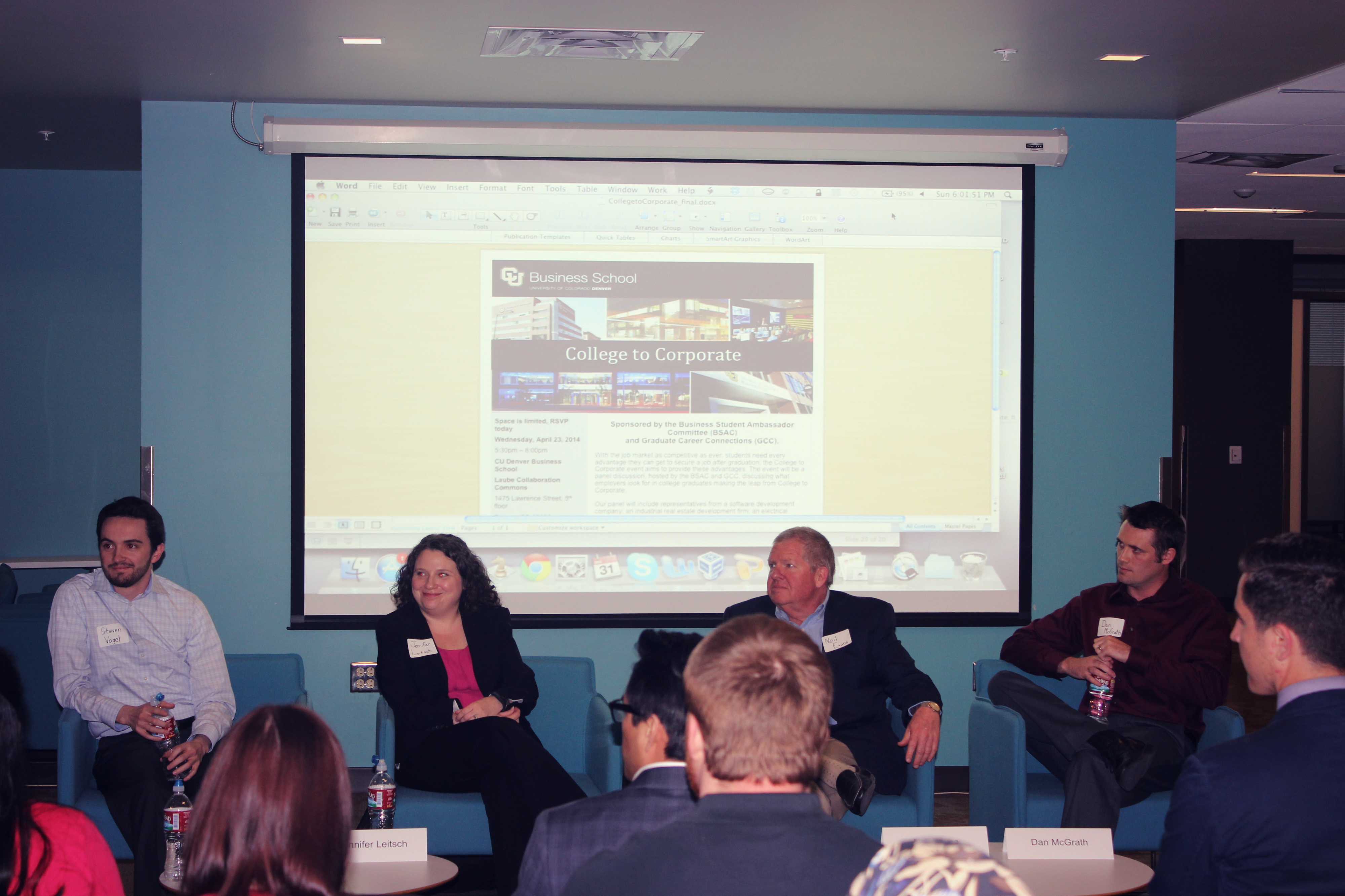 The Business Student Ambassador Club (BSAC) and Graduate Career Connections (GCC) at the CU Denver Business School recently hosted “College to Corporate;” a panel discussion and networking event. The event included presenters from four international companies, including Rocket, Arrow Electronics, Prologis and Raytheon.