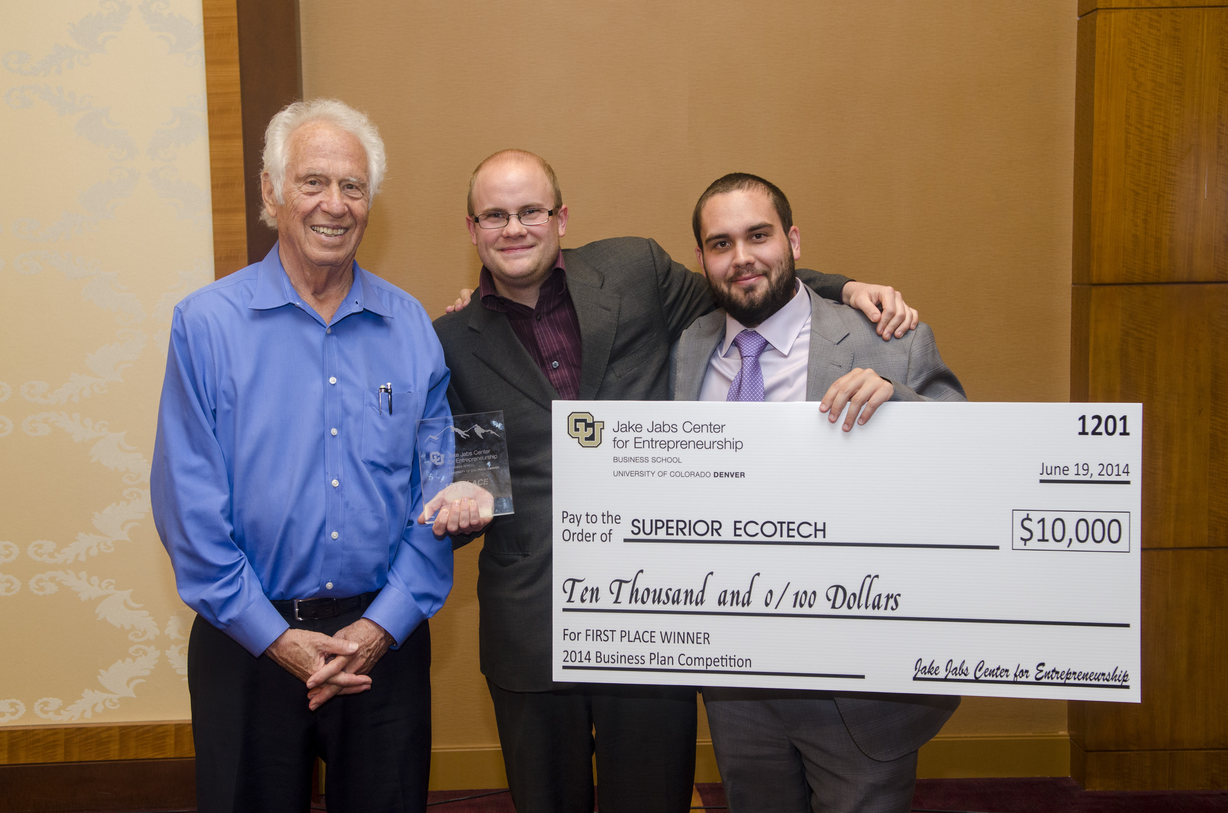 A novel way to create vegan spreads, cheese and dietary supplements using waste from breweries and ethanol plans won first prize Thursday in this year’s Business Plan Competition, sponsored by the Jake Jabs Center for Entrepreneurship at the University of Colorado Denver Business School. Daniel Higgs and Benjamin Mousseau won $10,000 for Superior Ecotech, a company that grows algae using waste carbon dioxide which then produces omega-3 rich oils for a range of products.