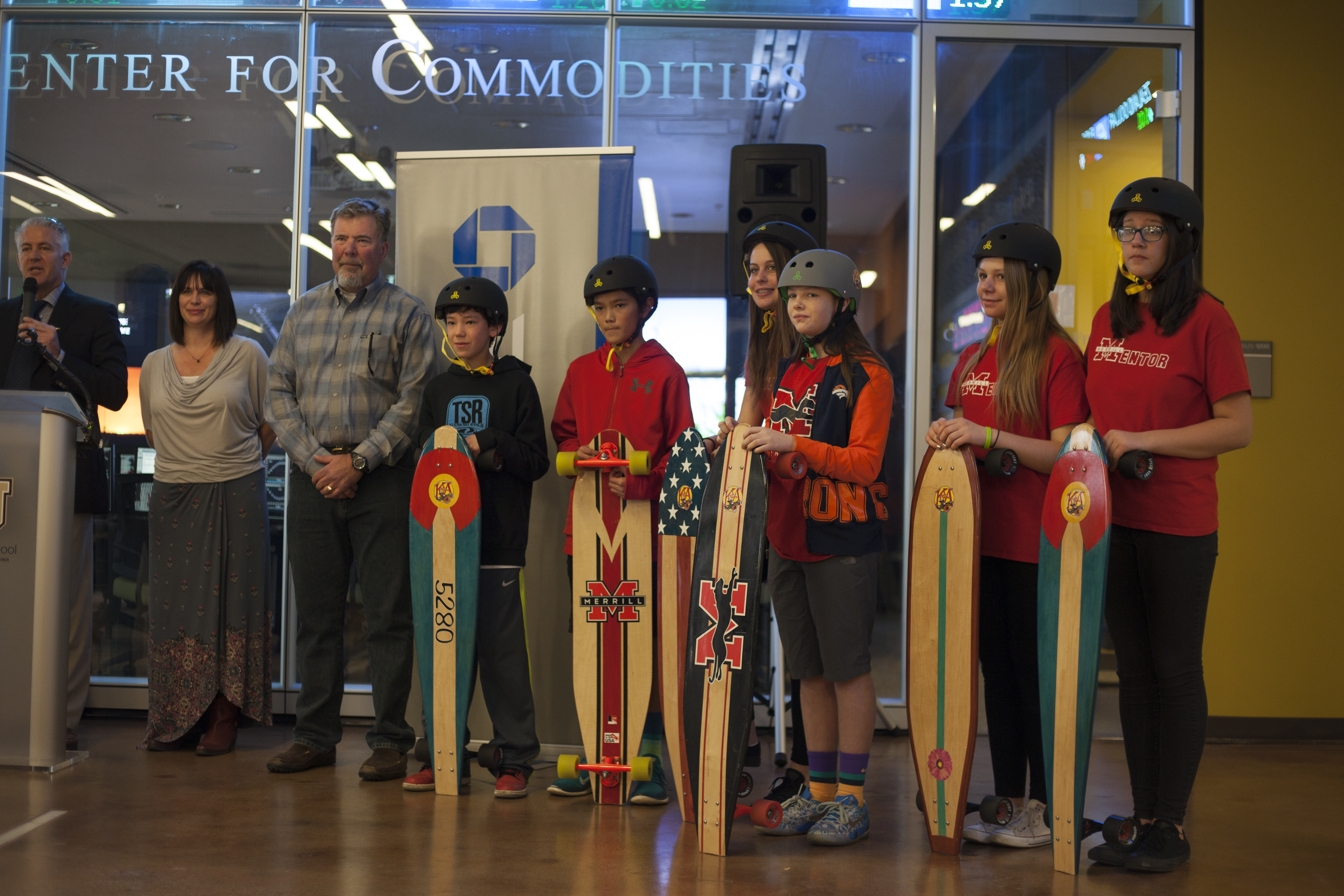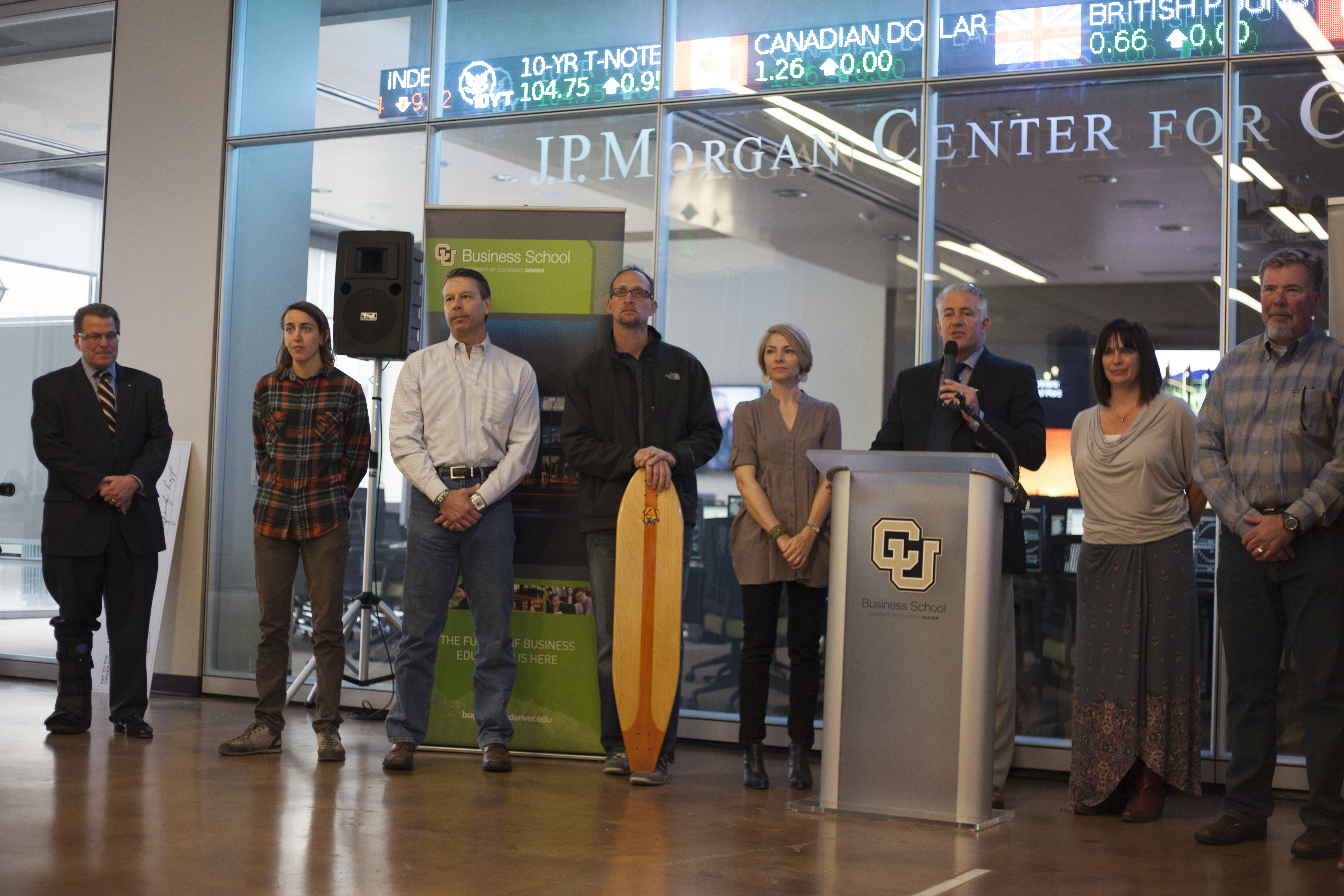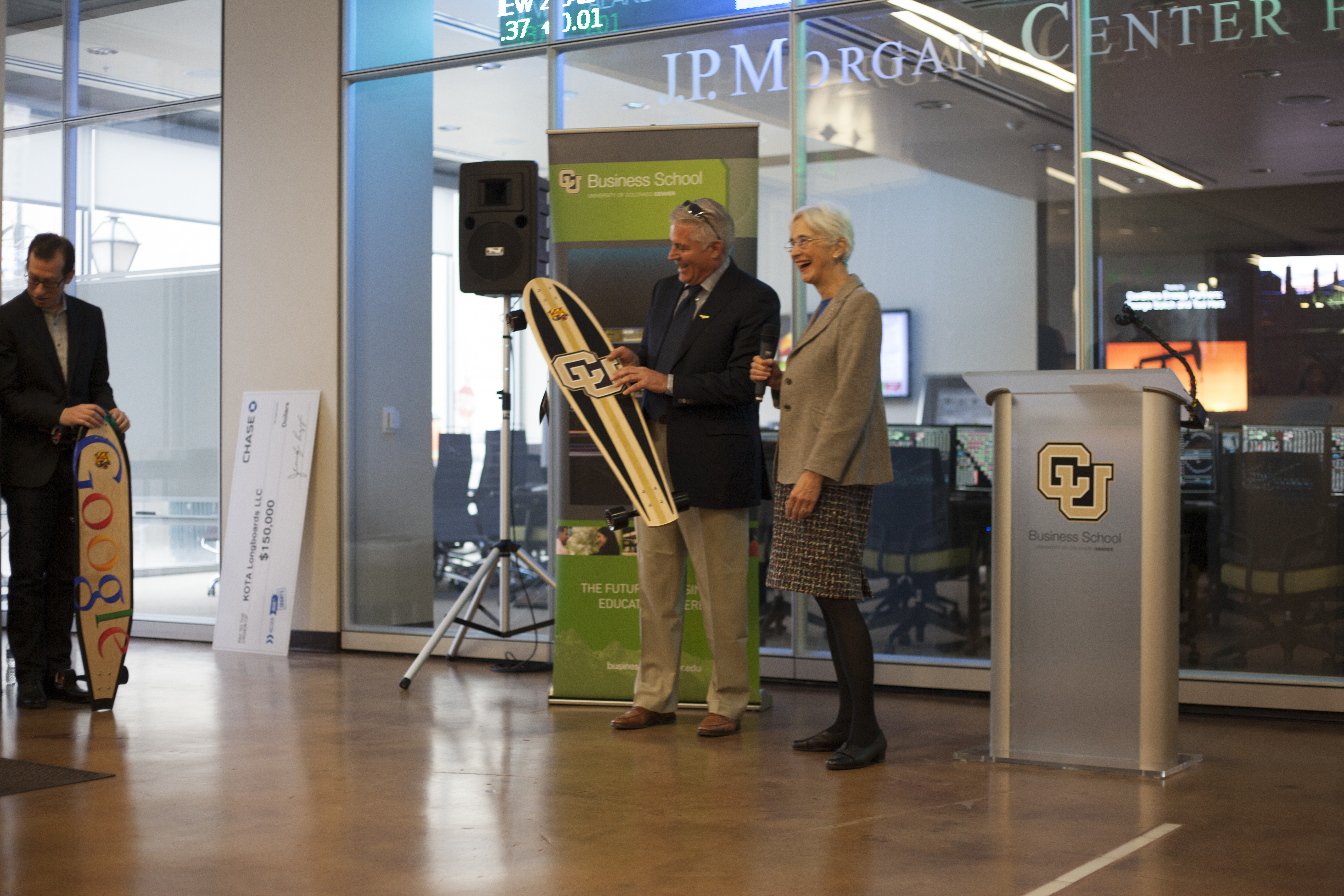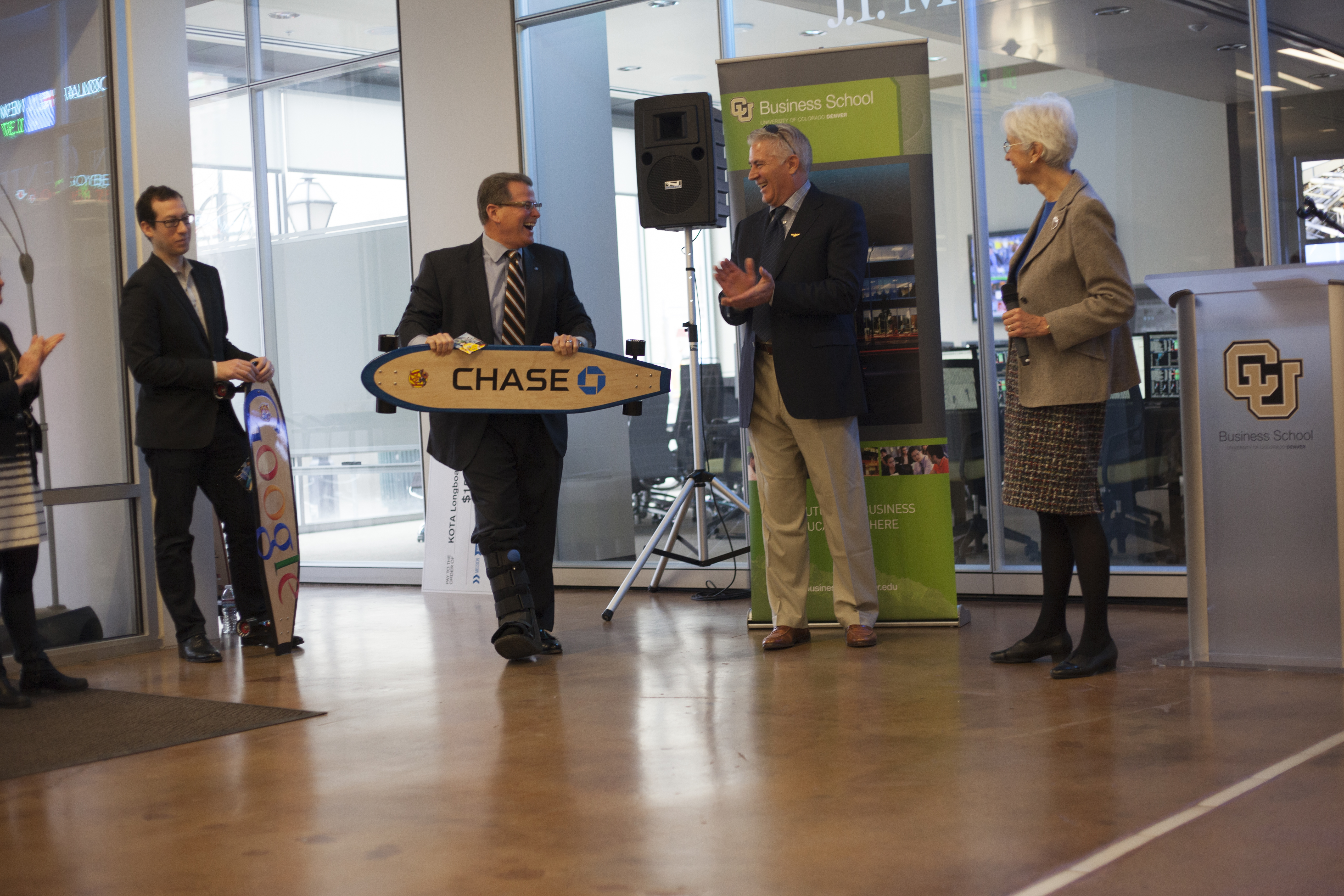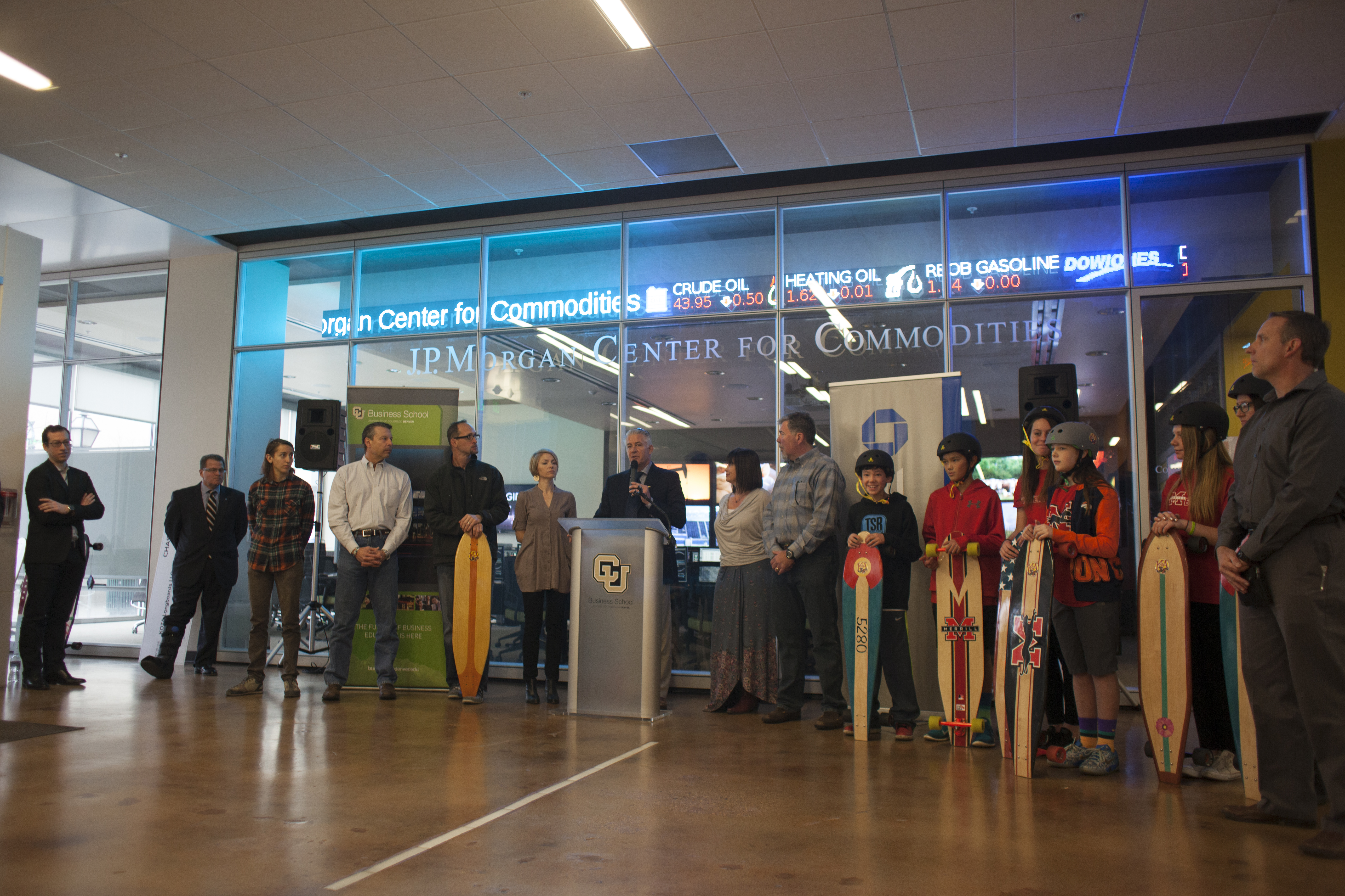 Highlights of the program included specially-designed KATO boards presented to Munson, Washington and Sondak, as well as to Ambron, who promptly boarded her longboard, emblazoned with the CU logo, next to the podium. Also, a group of students from Denver’s Merrill Middle School were on hand to demonstrate the boards. The more than 75 people in attendance parted to allow the students to ride the length of the lobby.