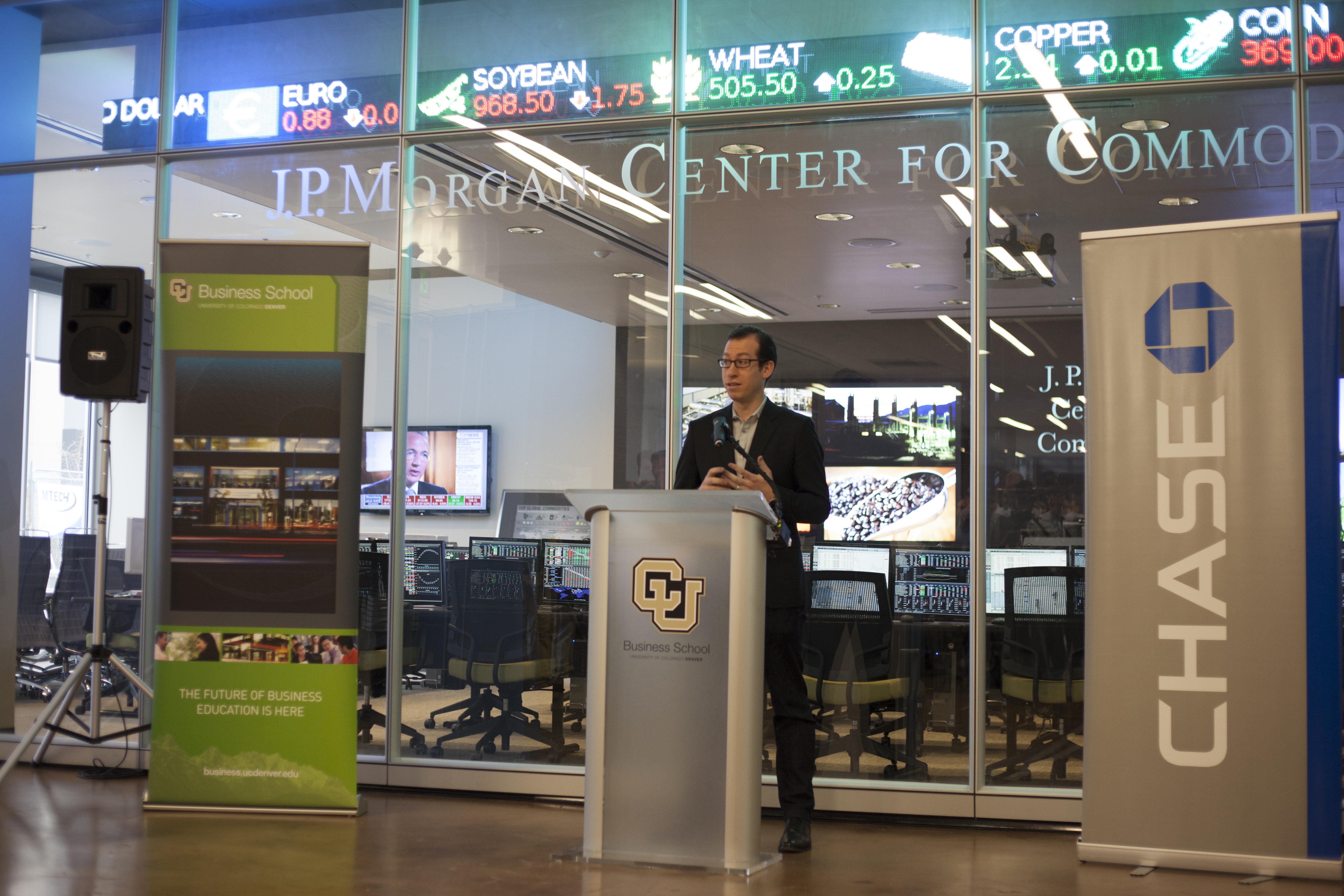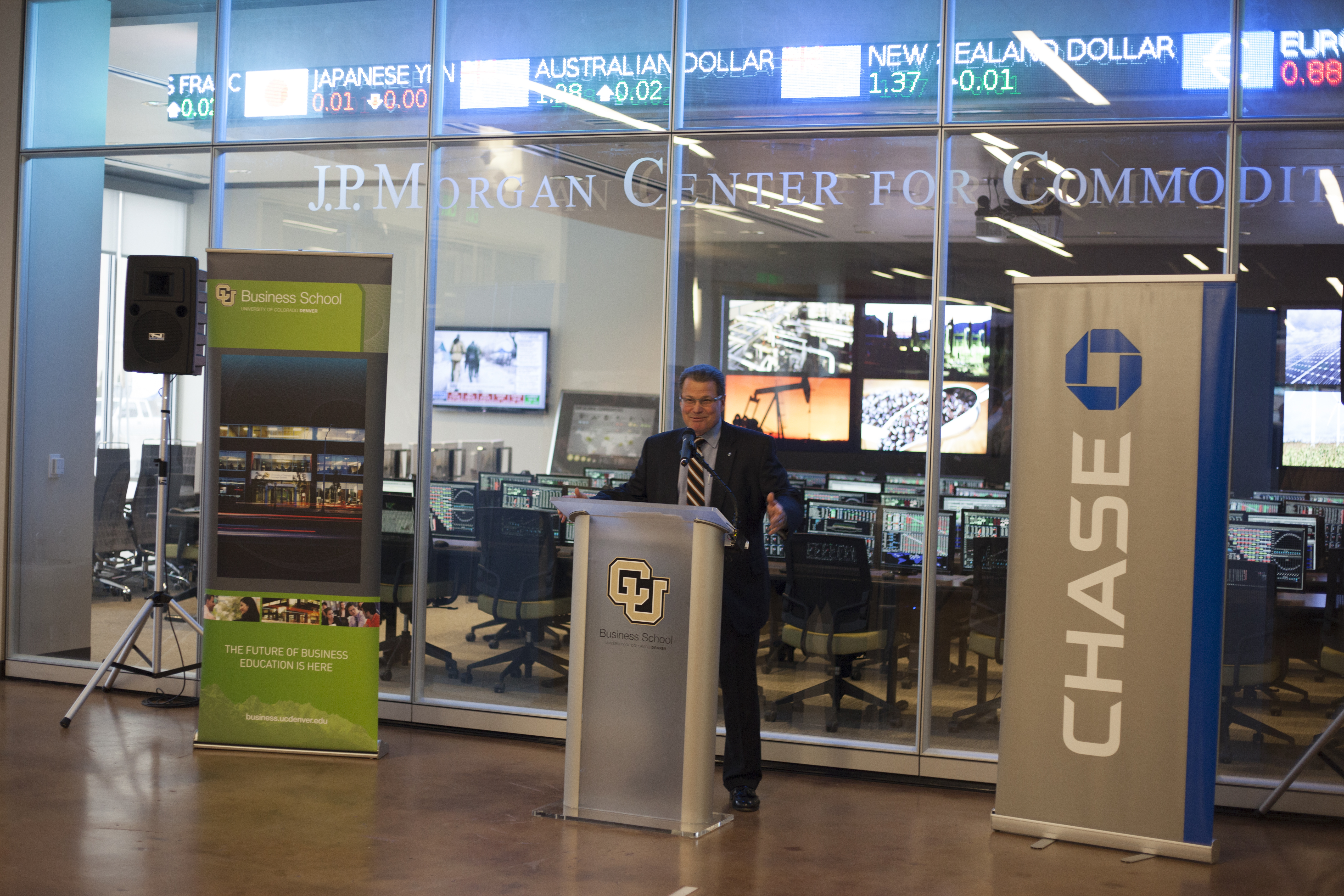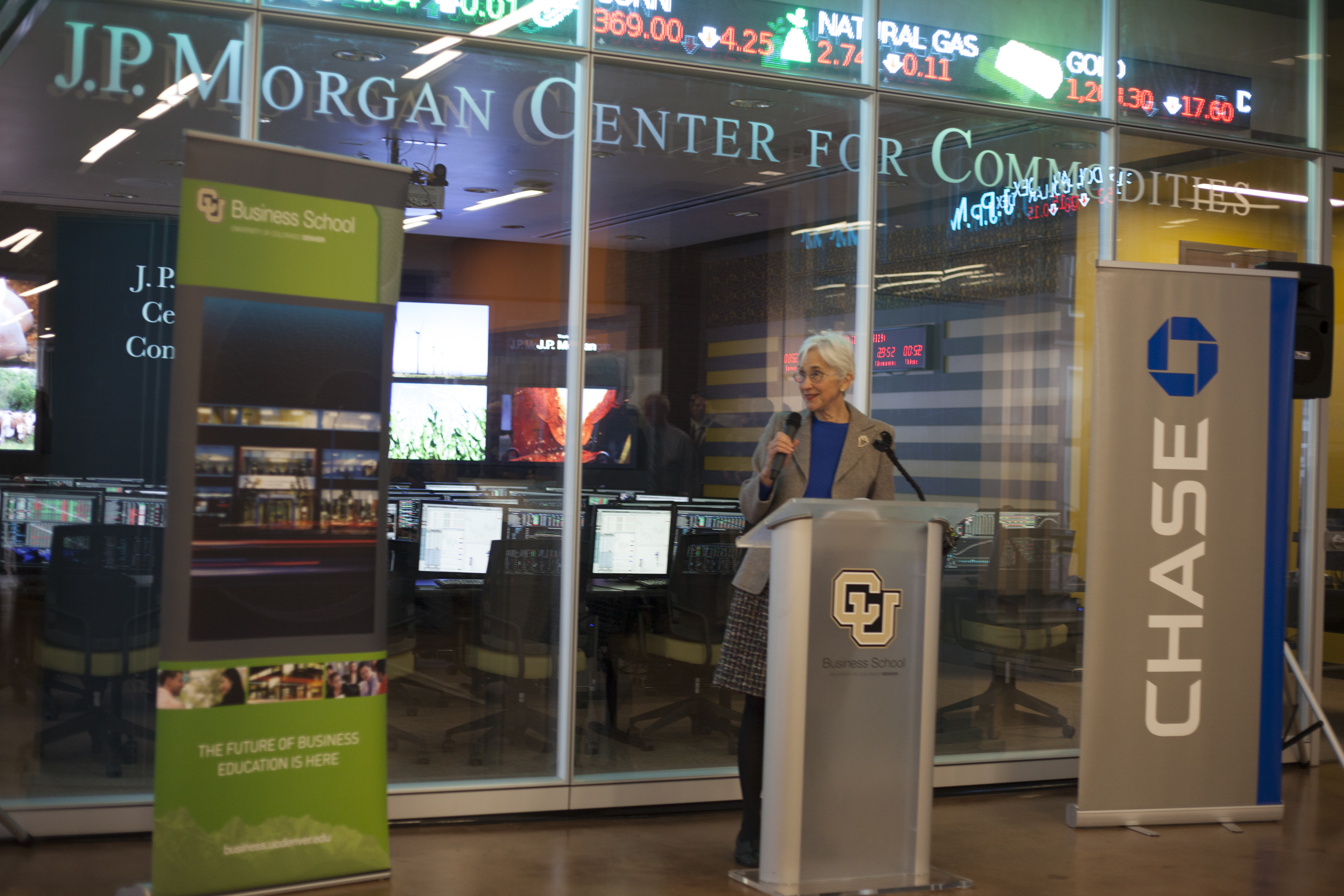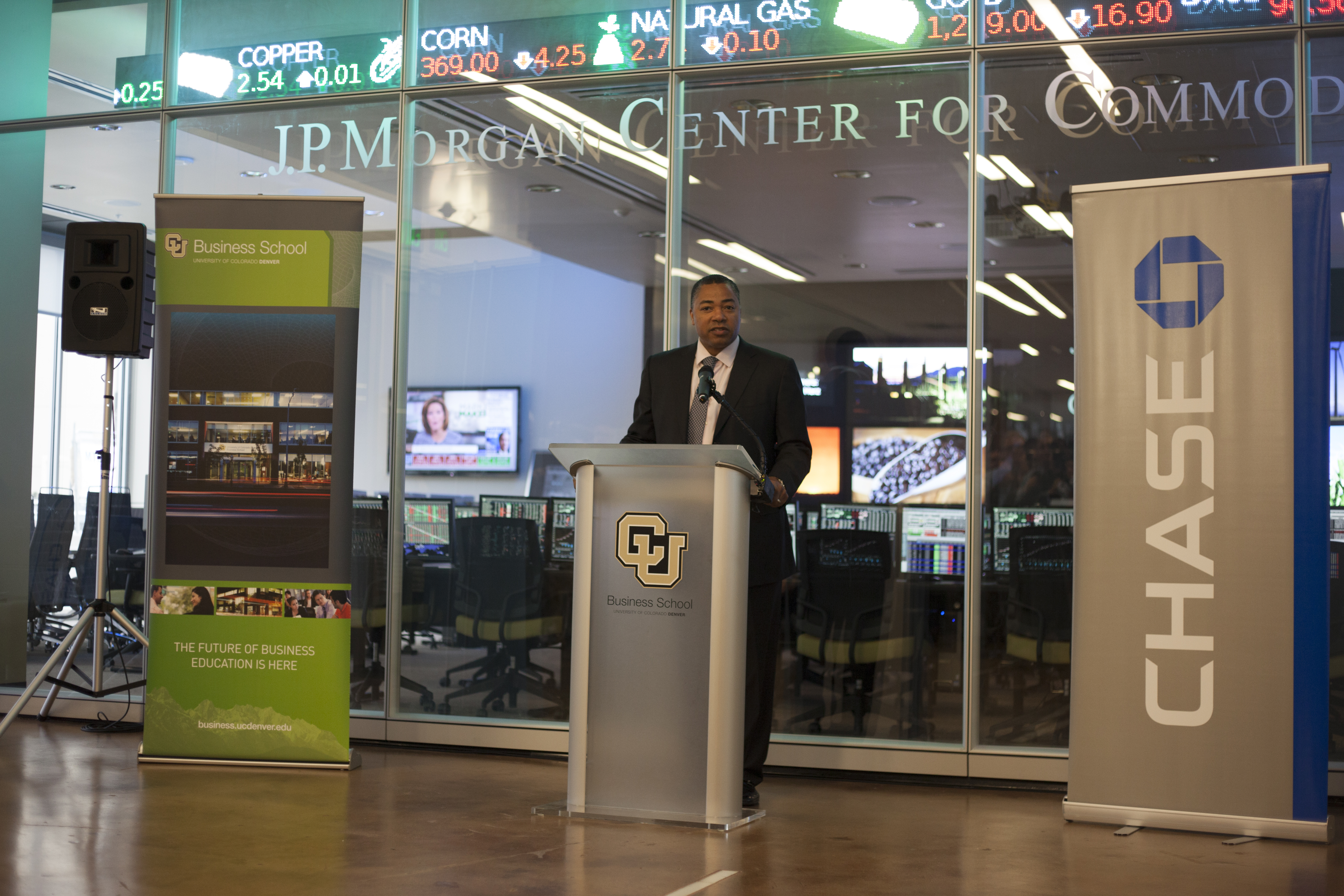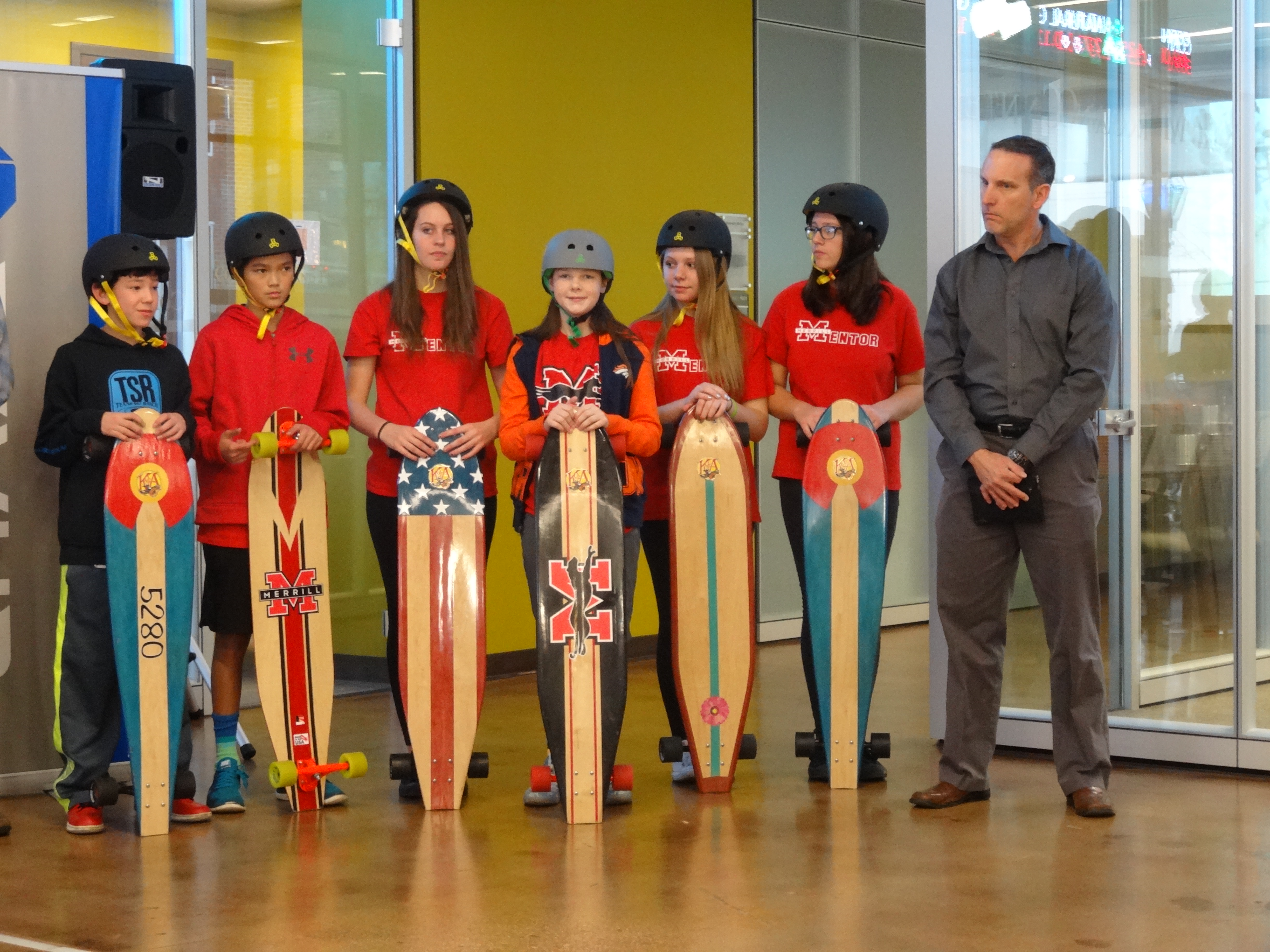 Highlights of the program included specially-designed KATO boards presented to Munson, Washington and Sondak, as well as to Ambron, who promptly boarded her longboard, emblazoned with the CU logo, next to the podium. Also, a group of students from Denver’s Merrill Middle School were on hand to demonstrate the boards. The more than 75 people in attendance parted to allow the students to ride the length of the lobby.