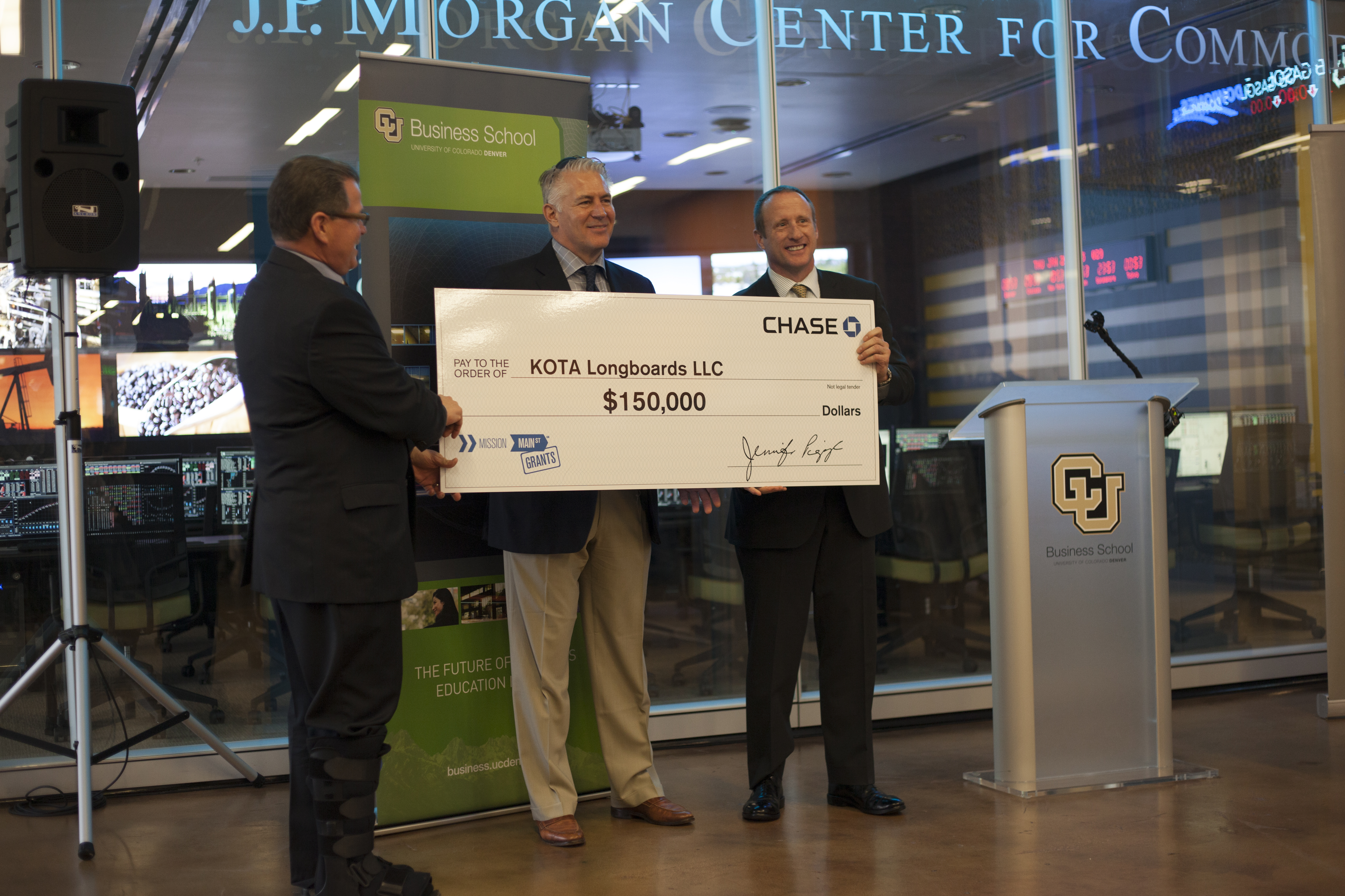 The fast rise of KOTA Longboards LLC and its visionary founder, Mike Maloney, a former U.S. Navy Top Gun pilot, was celebrated in a lively ceremony in the Business School lobby on Thursday. KOTA received a $150,000 Mission Main Street Grant from JPMorgan, which annually distributes $3 million in grants to promising and community-minded entrepreneurial businesses across the country.