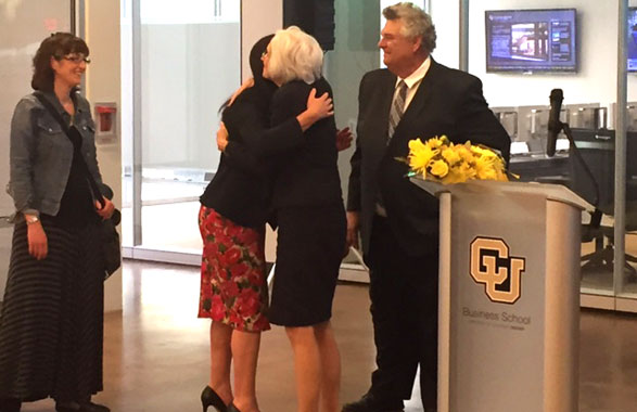 Wartgow extolled Ambron’s “phenomenal” leadership, not only in her vision of launching innovative programs and centers, but also for forging ever stronger connections between the Business School and the Colorado business community. “It’s the end of an era, Sueann. We’re going to miss you,” he said. “This is a much better place—not only at the Business School but the entire university—because Sueann Ambron was here.”